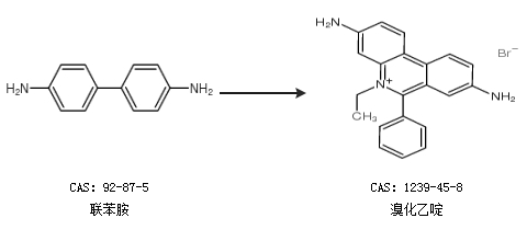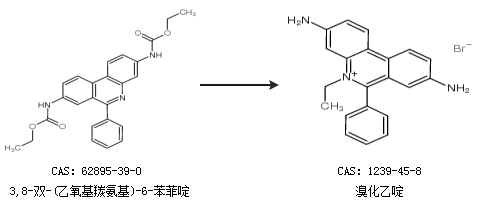 中文別名 溴化乙錠;菲啶溴紅;溴化-3,8-二氨基-5-乙基-6-苯基菲啶翁;3,8-二氨基-5-乙基-6-苯基菲啶溴化物;2,7-二氨基-9-苯基氮雜菲-10-乙基溴;溴化乙錠(EB);溴乙菲啶;