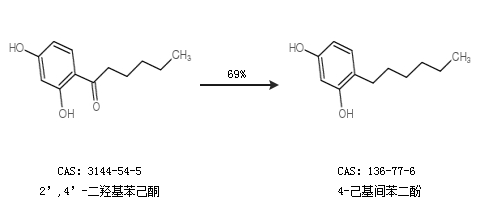 1.通過2’,4’-二羥基苯己酮合成4-己基間苯二酚,收率約69%;