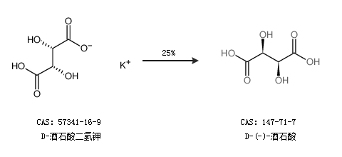 1.通過D-酒石酸二氫鉀合成D-(-)-酒石酸,收率約25%;