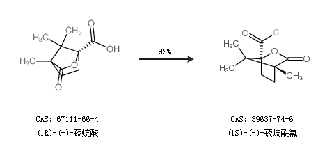 1.通過(1R)-(+)-莰烷酸合成(1S)-(-)-莰烷酰氯,收率約92%;