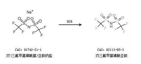 2.通過(guò)雙(三氟甲基磺?;?亞胺鈉鹽合成雙三氟甲基磺酰亞胺,收率約92%;