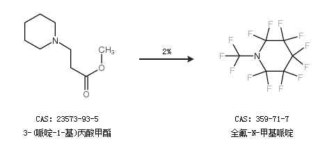 1.通過(guò)3-(哌啶-1-基)丙酸甲酯合成全氟-N-甲基哌啶,收率約2%;