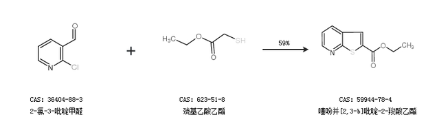 1.通過(guò)2-氯-3-吡啶甲醛和巰基乙酸乙酯合成噻吩并[2,3-b]吡啶-2-羧酸乙酯,收率約59%;