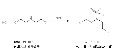 1.通過二(2-氯乙基)胺鹽酸鹽合成雙(2-氯乙基)氨基磷酰二氯,收率約99%;