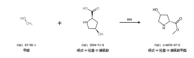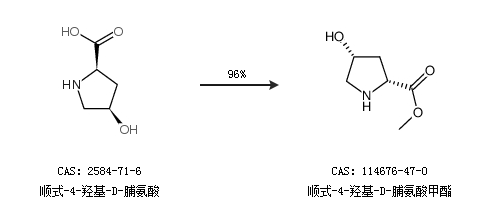 1.通過甲醇和順式-4-羥基-D-脯氨酸合成順式-4-羥基-D-脯氨酸甲酯,收率約99%;