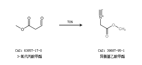 1.通過3-氧代丙酸甲酯合成異腈基乙酸甲酯,收率約70%;