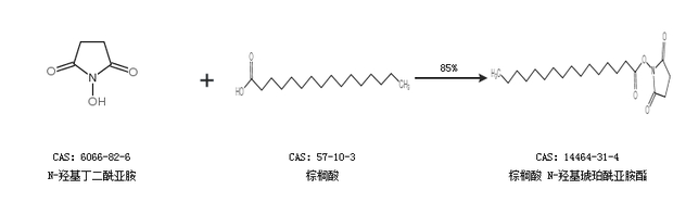 2.通過N-羥基丁二酰亞胺和棕櫚酸合成棕櫚酸 N-羥基琥珀酰亞胺酯,收率約85%;