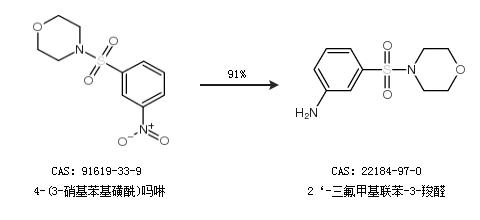 1.通過4-(3-硝基苯基磺酰)嗎啉合成2‘-三氟甲基聯(lián)苯-3-羧醛,收率約91%;