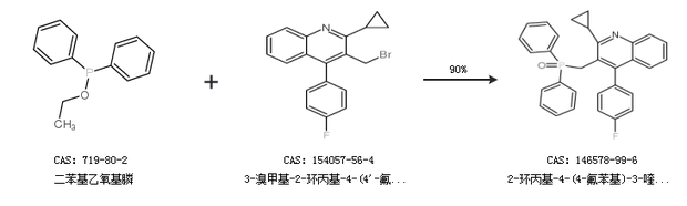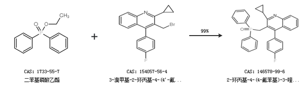 1.通過二苯基乙氧基膦和3-溴甲基-2-環(huán)丙基-4-(4''-氟苯基)喹啉合成2-環(huán)丙基-4-(4-氟苯基)-3-喹啉甲基二苯基氧膦,收率約90%;