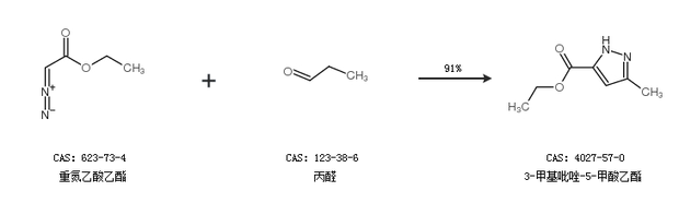 2.通過重氮乙酸乙酯和丙醛合成3-甲基吡唑-5-甲酸乙酯,收率約91%;
