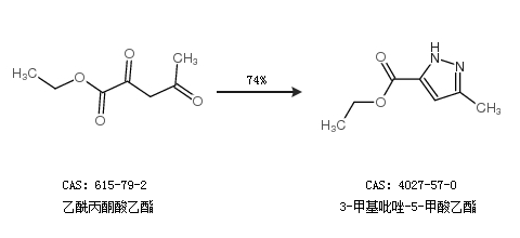 1.通過乙酰丙酮酸乙酯合成3-甲基吡唑-5-甲酸乙酯,收率約74%;