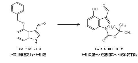 1.通過(guò)4-苯甲氧基吲哚-3-甲醛合成3-甲酰基-4-羥基吲哚-1-羧酸叔丁酯