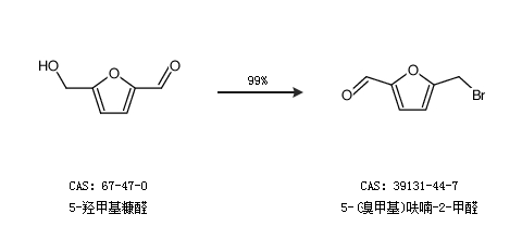 1.通過5-羥甲基糠醛合成5-(溴甲基)呋喃-2-甲醛,收率約99%;