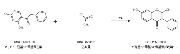 1.通過2'',4''-二羥基-2-苯基苯乙酮和乙酰氯合成7-羥基-2-甲基-3-苯基苯并吡喃-4-酮,收率約82%;