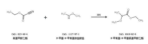 2.通過氰基甲酸乙酯和N-甲基-N-甲氧基胺鹽酸鹽合成N-甲氧基-N-甲基氨基甲酸乙酯,收率約36%;
