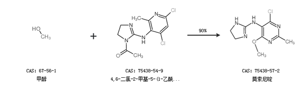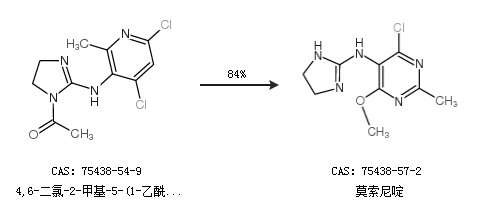 2.通過甲醇和4,6-二氯-2-甲基-5-(1-乙?;?2-咪唑)-氨基吡啶合成莫索尼啶,收率約90%;