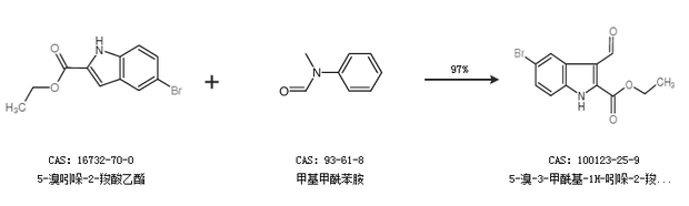 2.通過5-溴吲哚-2-羧酸乙酯和甲基甲酰苯胺合成5-溴-3-甲?;?1H-吲哚-2-羧酸乙酯,收率約97%;