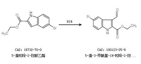 1.通過5-溴吲哚-2-羧酸乙酯合成5-溴-3-甲酰基-1H-吲哚-2-羧酸乙酯,收率約81%;