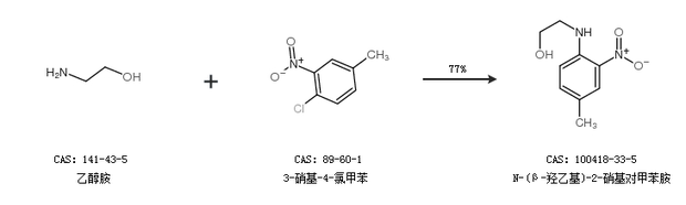 1.通過乙醇胺和3-硝基-4-氯甲苯合成N-(β-羥乙基)-2-硝基對(duì)甲苯胺,收率約77%;