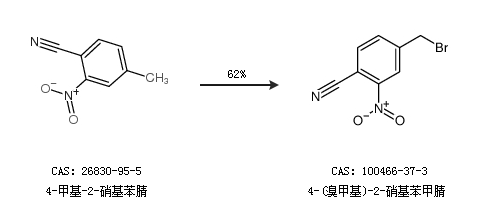 1.通過(guò)4-甲基-2-硝基苯腈合成4-(溴甲基)-2-硝基苯甲腈,收率約62%;