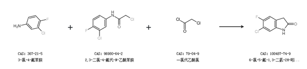 2.通過(guò)3-氯-4-氟苯胺、2,3-二氯-4-氟代-N-乙酰苯胺和一氯代乙酰氯合成6-氯-5-氟-1,3-二氫-2H-吲哚-2-酮