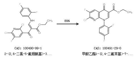1.通過(guò)2-(2,6-二氯-5-氟煙?;?-3-((2,4-二氟苯基)氨基)丙烯酸乙酯合成甲酸乙酯1-(2,4-二氟苯基)-7-氯-6-氟-4-氧代羥基吡啶[2,3-B]吡啶-3-羧酸,收率約89%;