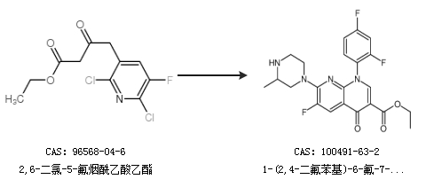 2.通過(guò)2,6-二氯-5-氟煙酰乙酸乙酯合成1-(2,4-二氟苯基)-6-氟-7-(3-甲基哌嗪-1-基)-4-氧代-1,4-二氫-1,8-萘啶-3-羧酸乙酯