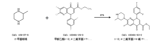 1.通過(guò)2-甲基哌嗪和甲酸乙酯1-(2,4-二氟苯基)-7-氯-6-氟-4-氧代羥基吡啶[2,3-B]吡啶-3-羧酸合成1-(2,4-二氟苯基)-6-氟-7-(3-甲基哌嗪-1-基)-4-氧代-1,4-二氫-1,8-萘啶-3-羧酸乙酯,收率約87%;