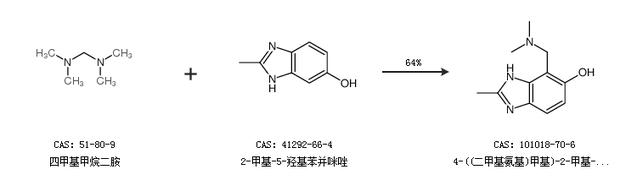 1.通過四甲基甲烷二胺和2-甲基-5-羥基苯并咪唑合成4-((二甲基氨基)甲基)-2-甲基-1H-苯并[d]咪唑-5-醇,收率約64%;