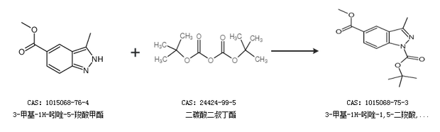 1.通過3-甲基-1H-吲唑-5-羧酸甲酯和二碳酸二叔丁酯合成3-甲基-1H-吲唑-1,5-二羧酸,1-(1,1-二甲基乙基)5-甲酯