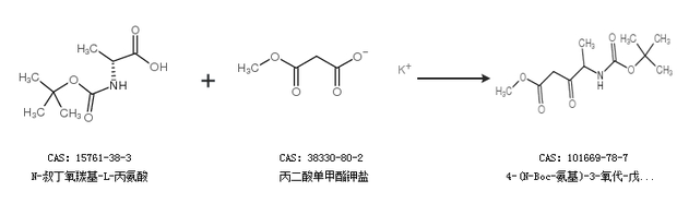 1.通過N-叔丁氧羰基-L-丙氨酸和丙二酸單甲酯鉀鹽合成4-(N-Boc-氨基)-3-氧代-戊酸甲酯