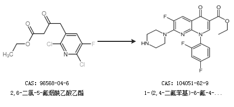 2.通過2,6-二氯-5-氟煙酰乙酸乙酯合成1-(2,4-二氟苯基)-6-氟-4-氧代-7-(哌嗪-1-基)-1,4-二氫-1,8-萘啶-3-羧酸乙酯