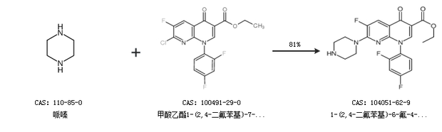 1.通過哌嗪和甲酸乙酯1-(2,4-二氟苯基)-7-氯-6-氟-4-氧代羥基吡啶[2,3-B]吡啶-3-羧酸合成1-(2,4-二氟苯基)-6-氟-4-氧代-7-(哌嗪-1-基)-1,4-二氫-1,8-萘啶-3-羧酸乙酯,收率約81%;