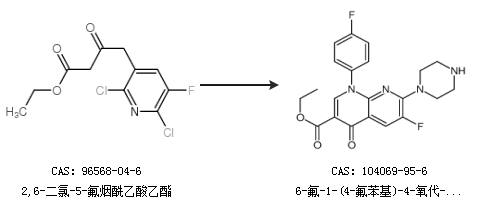 2.通過2,6-二氯-5-氟煙酰乙酸乙酯合成6-氟-1-(4-氟苯基)-4-氧代-7-(哌嗪-1-基)-1,4-二氫-1,8-萘啶-3-羧酸乙酯