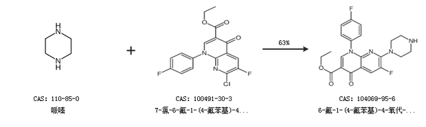 1.通過哌嗪和7-氯-6-氟-1-(4-氟苯基)-4-氧代-1,4-二氫-1,8-萘啶-3-羧酸乙酯合成6-氟-1-(4-氟苯基)-4-氧代-7-(哌嗪-1-基)-1,4-二氫-1,8-萘啶-3-羧酸乙酯,收率約63%;