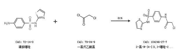 1.通過磺胺噻唑和一氯代乙酰氯合成2-氯-N-{4-[(1,3-噻唑-2-氨基)磺酰基]苯基}乙酰胺,收率約81%;