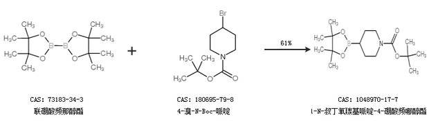 2.通過聯(lián)硼酸頻那醇酯和4-溴-N-Boc-哌啶合成1-N-叔丁氧羰基哌啶-4-硼酸頻哪醇酯,收率約61%;