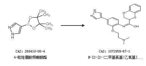 1.通過4-吡唑硼酸頻哪醇酯合成N-[2-[2-(二甲基氨基)乙氧基]-4-(1H-吡唑-4-基)苯基]-2,3-二氫-1,4-苯并二惡烷-2-甲酰胺