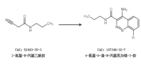 1.通過(guò)2-氰基-N-丙基乙酰胺合成4-氨基-8-溴-N-丙基氮雜嗪-3-胺