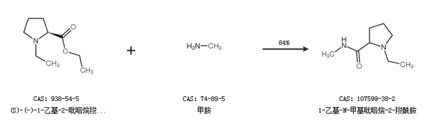 1.通過(S)-(-)-1-乙基-2-吡咯烷羧酸乙酯和甲胺合成1-乙基-N-甲基吡咯烷-2-羧酰胺,收率約84%;
