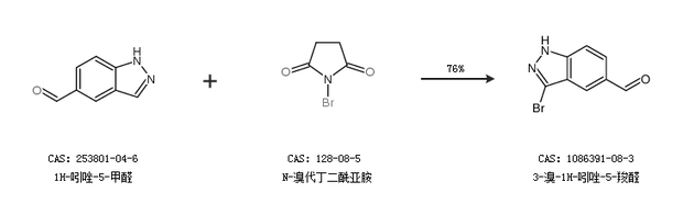 2.通過1H-吲唑-5-甲醛和N-溴代丁二酰亞胺合成3-溴-1H-吲唑-5-羧醛,收率約76%;