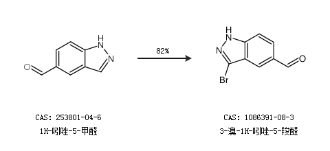1.通過1H-吲唑-5-甲醛合成3-溴-1H-吲唑-5-羧醛,收率約82%;