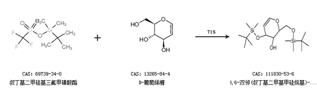 2.通過叔丁基二甲硅基三氟甲磺酸酯和D-葡萄烯糖合成3,6-雙鄰(叔丁基二甲基甲硅烷基)-D-葡萄烯糖,收率約71%;