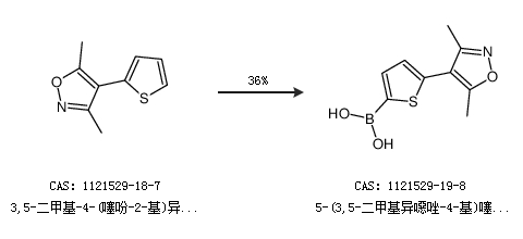 1.通過(guò)3,5-二甲基-4-(噻吩-2-基)異噁唑合成5-(3,5-二甲基異噁唑-4-基)噻吩-2-基-2-硼酸,收率約36%;