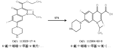 1.通過(guò)6-氟-7-哌嗪-1-甲基-4-氧代-[1,3]硫氮雜環(huán)[3,2-a]喹啉-3-羧酸乙酯合成6-氟-7-哌嗪-1-甲基-4-氧-[1,3]硫氮雜環(huán)[3,2-a]-喹啉-3-羧酸,收率約97%;
