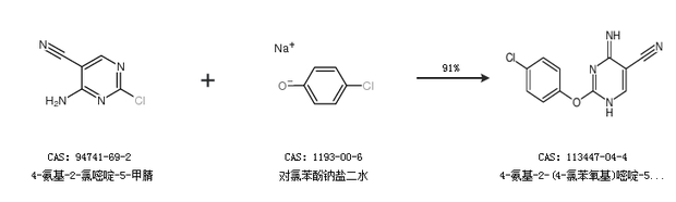 1.通過4-氨基-2-氯嘧啶-5-甲腈和對氯苯酚鈉鹽二水合成4-氨基-2-(4-氯苯氧基)嘧啶-5-甲腈,收率約91%;