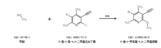 2.通過甲醇和5-溴-2-氯-4,6-二甲基尼古丁腈合成5-溴-2-甲氧基-4,6-二甲基煙腈,收率約68%;