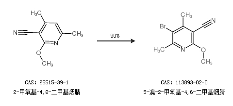 1.通過2-甲氧基-4,6-二甲基煙腈合成5-溴-2-甲氧基-4,6-二甲基煙腈,收率約90%;