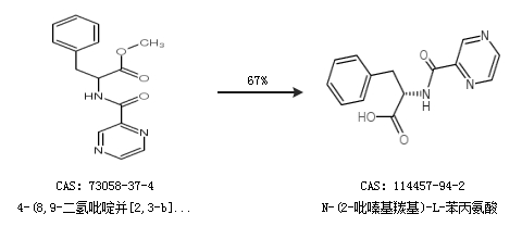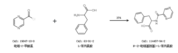 1.通過吡嗪-2-甲酰氯和L-苯丙氨酸合成N-(2-吡嗪基羰基)-L-苯丙氨酸,收率約37%;