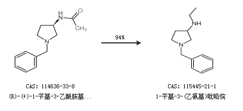 1.通過(guò)(R)-(+)-1-芐基-3-乙酰胺基吡咯烷合成1-芐基-3-(乙氨基)吡咯烷,收率約94%;